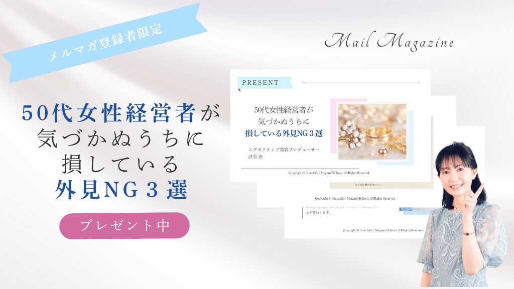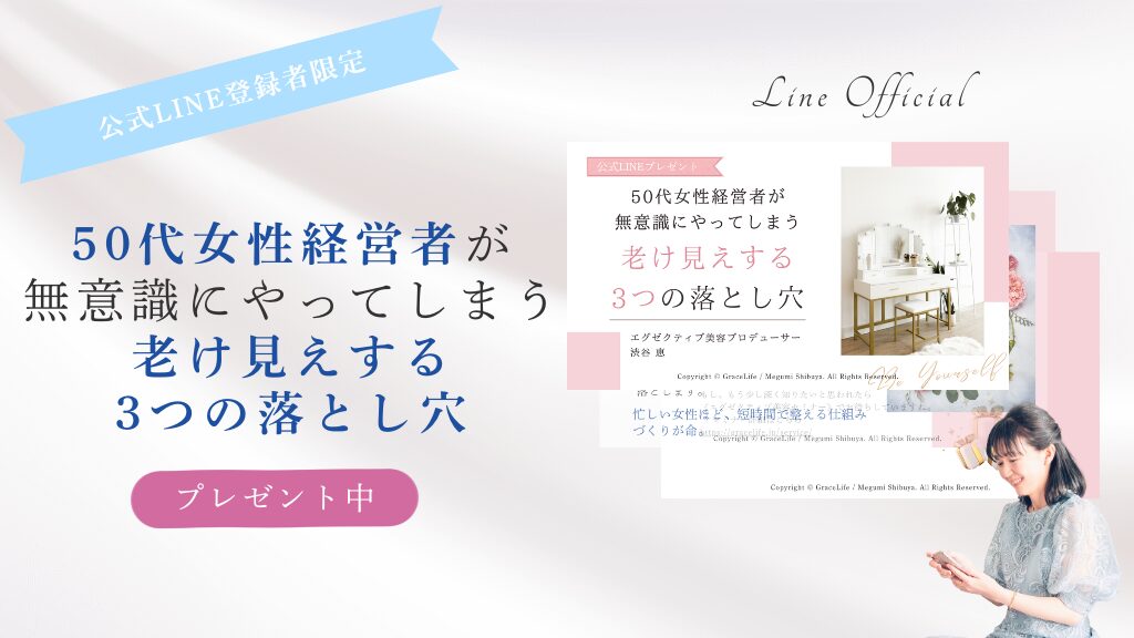 Megumiこんにちは、経営者のためのエグゼクティブ美容家 渋谷 恵(しぶや めぐみ)です。